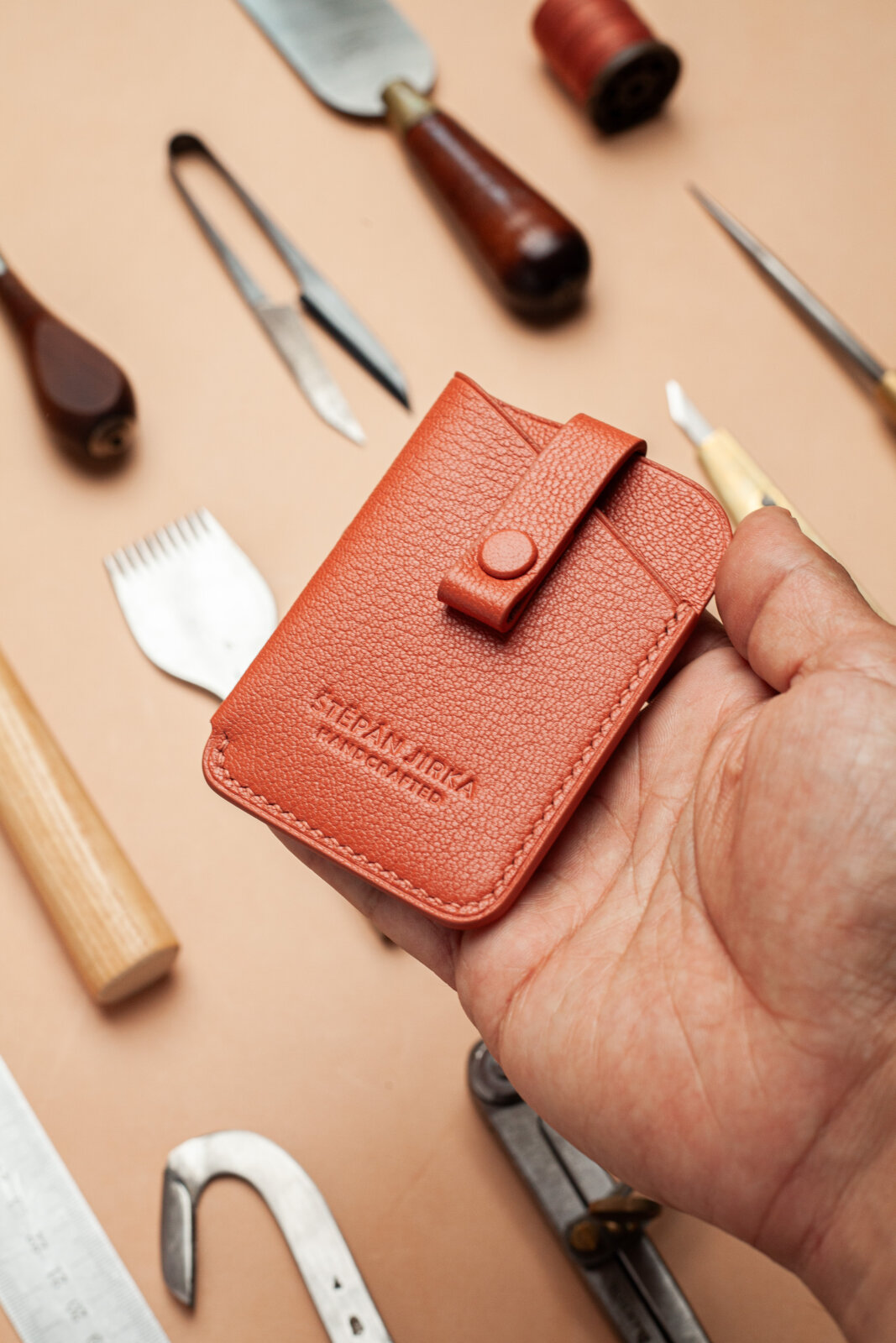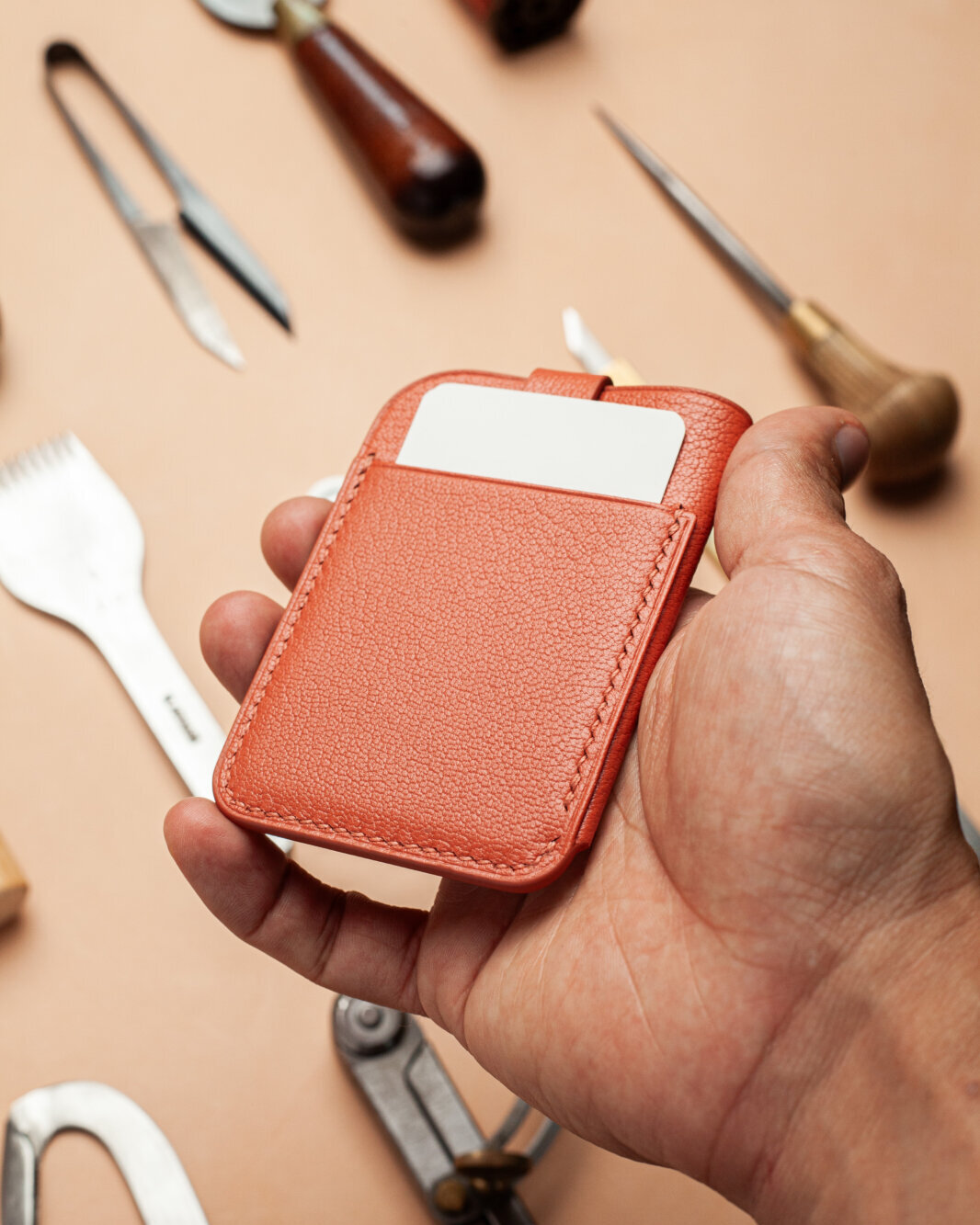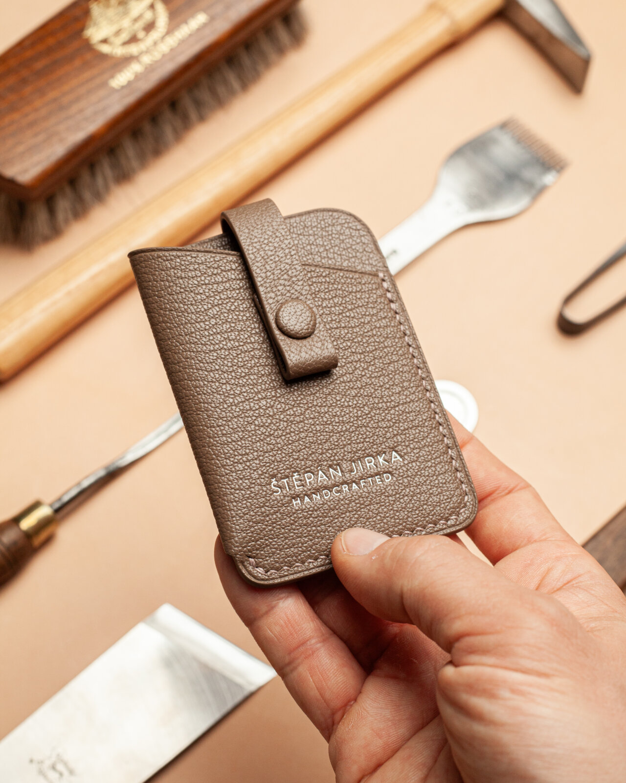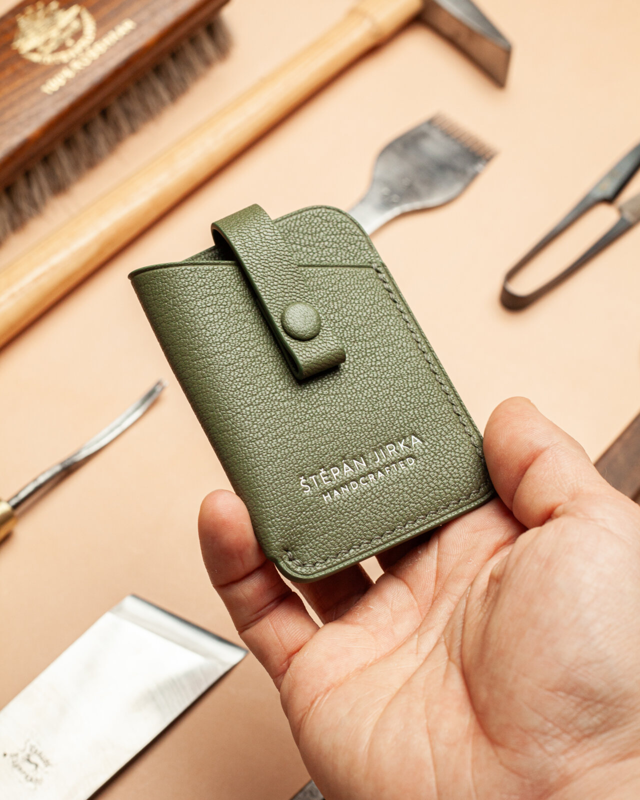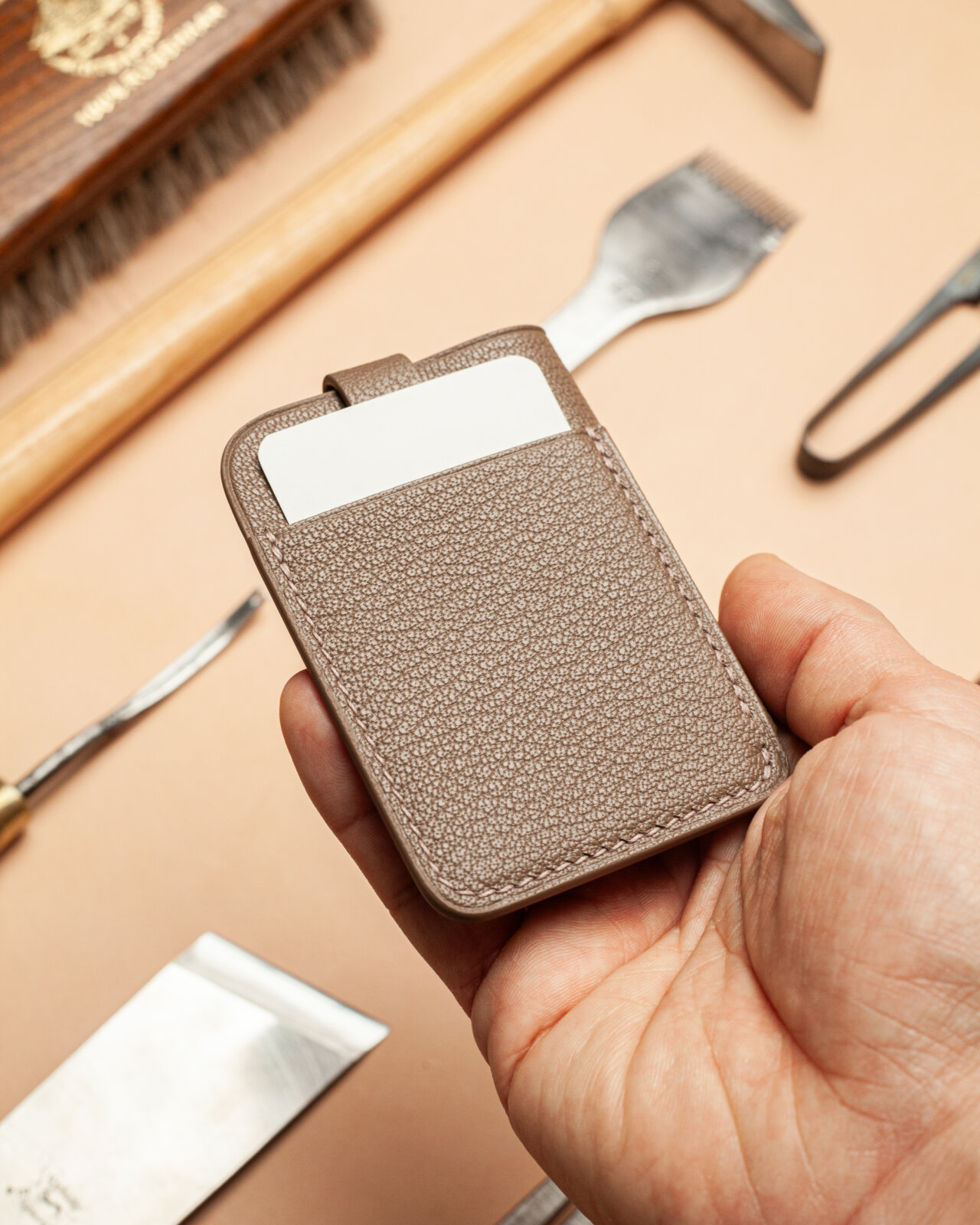 A minimalist vertical card sleeve with practical details such as the quick-access card slot on the back side or the snap button closure in the front. The wallet has a hot stamped silver branding on the front side.
